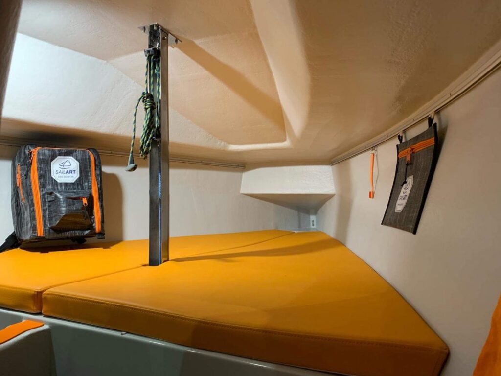 Das Design orientiert sich an den zeitgemäßen Linien und ausgeprägten Chines mit negativem Bug. Das Sportboot hat erstaunlich viel Platz im Cockpit und eine komfortable Kajüte für 2 Personen. Der optionale Antrieb ist ein 3 PS starker E-Motor (9 Kg), welcher durch die im Boot Integrierten Solarpanele autark geladen wird.