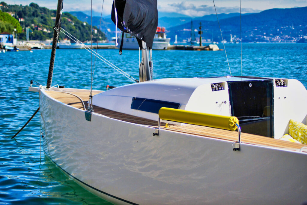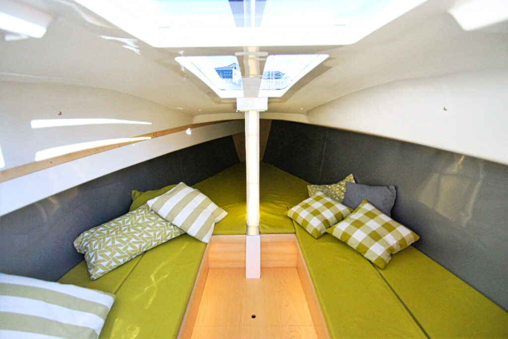 Die Formensprache ist klar, modern und aufgeräumt. Beschläge und Leinen sind verdeckt, was in dieser Größenklasse bisher einzigartig ist. Der Innenraum ist ebenfalls in einem klaren Design mit hochwertigsten Materialien, ausreichend groß um zu übernachten ohne auf Komfort wie z.B. Kühlbox, Toilette und Schränke zu verzichten.